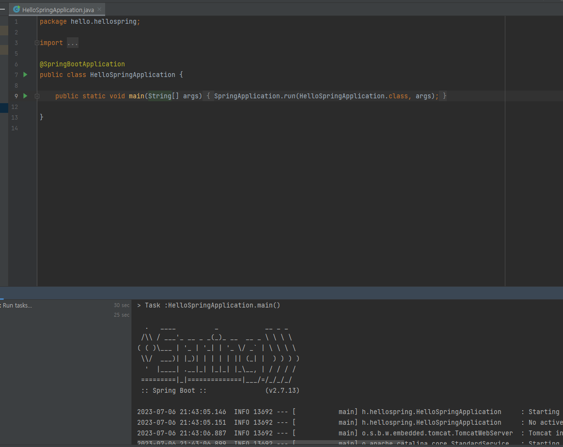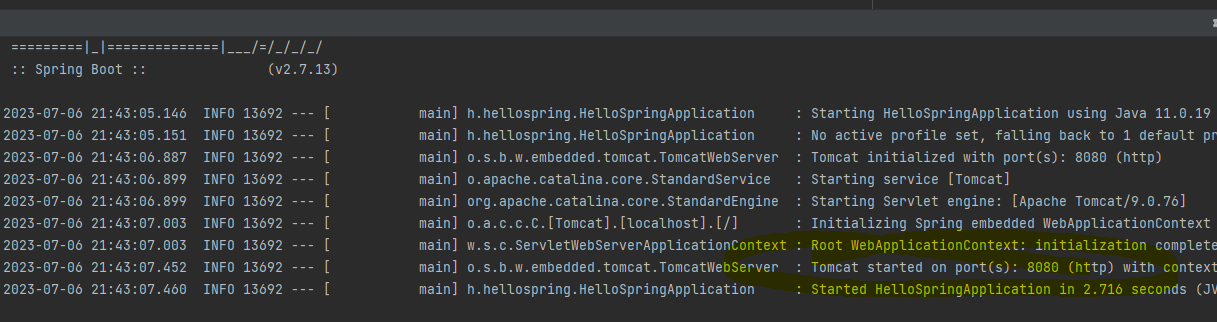 아무튼 main 메서드를 실행시키면 다음과 같은 화면이 보이게 된다. 스프링 부트 버전이 보이고 아래를 살펴보겠다.