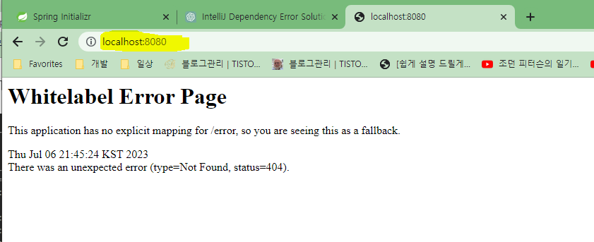 웹 브라우저에서 localhost:8080 을 들어가서 위와 같은 에러 페이지가 보이면 정상적으로 성공한 것으로 볼 수 있다.