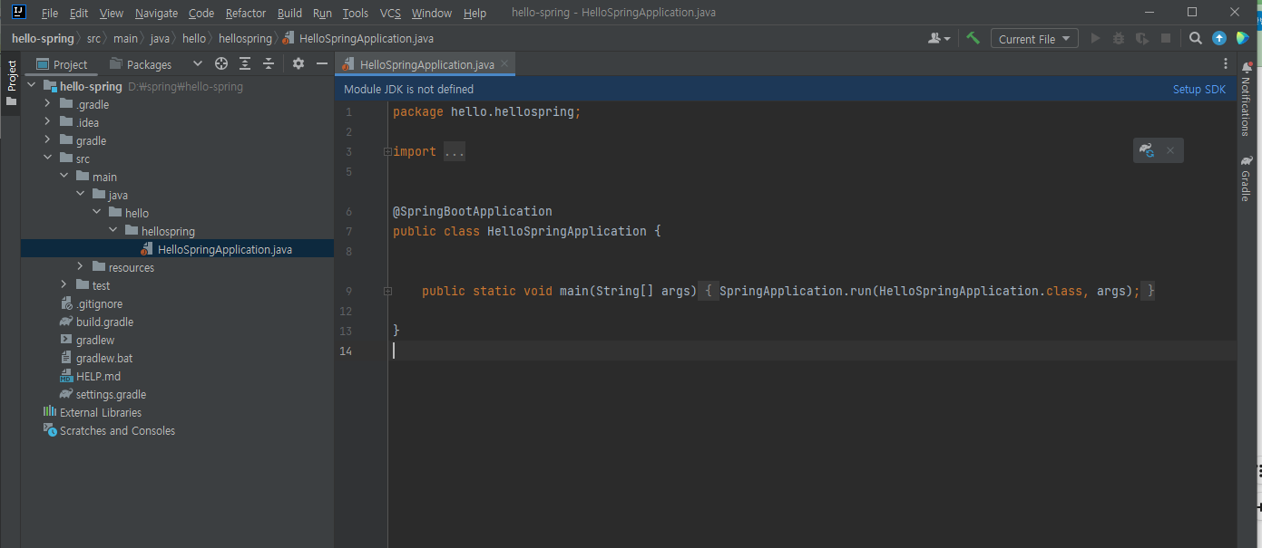 java 파일에 미리 생성된 java 파일이 하나 있는데 열어보면 @SpringBootApplication 이라는 어노테이션이 있는 것을 볼 수 있습니다.