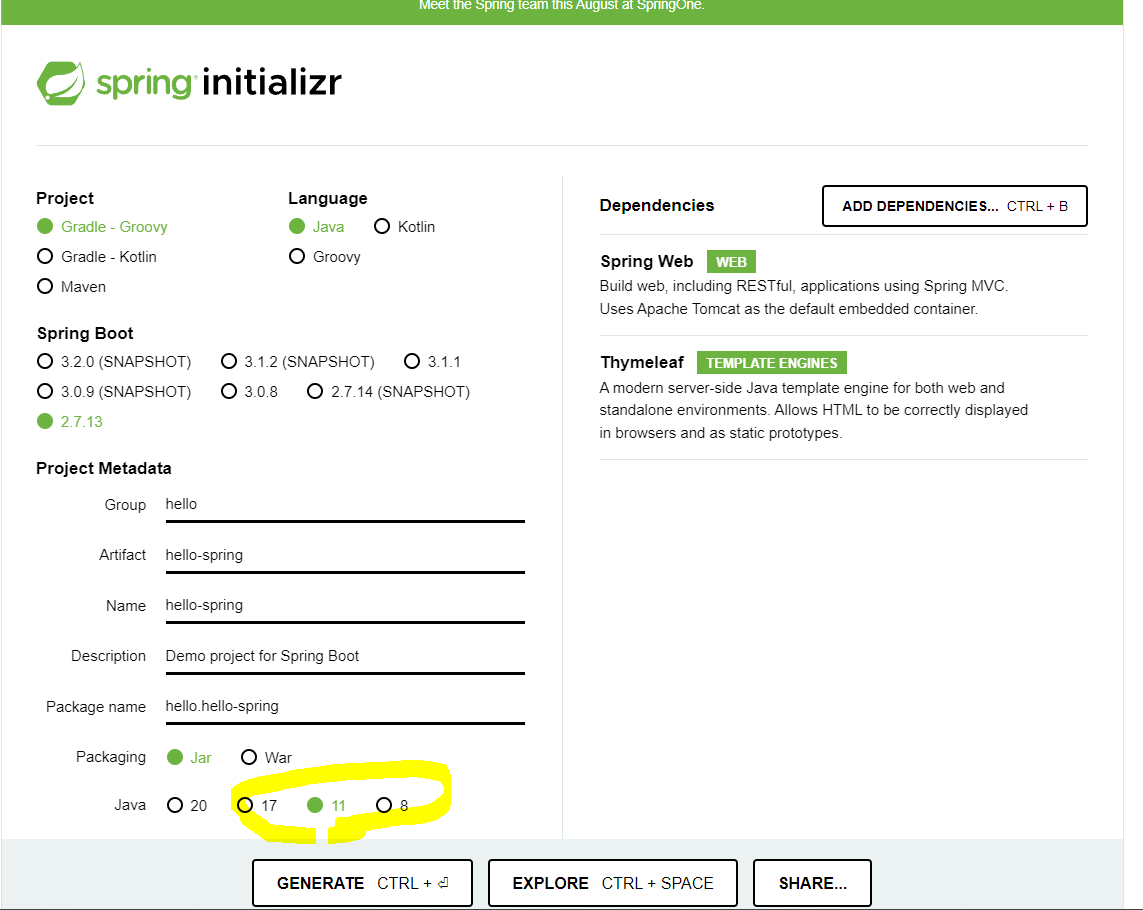 우선 우리는 웹을 개발할 것이기 때문에 Spring Web 을 추가해줍니다. 그 다음 우리는 Thymeleaf 라는 것도 사용할 것인데, 이것은 HTML 을 만들어주는 템플릿 엔진입니다. 템플릿 엔진은 여러가지가 있는데 딱히 마음에 드는 것이 없습니다. 이것은 회사마다 사용하는 것이 다릅니다. 어쨌든 우리는 2가지를 선택했습니다.