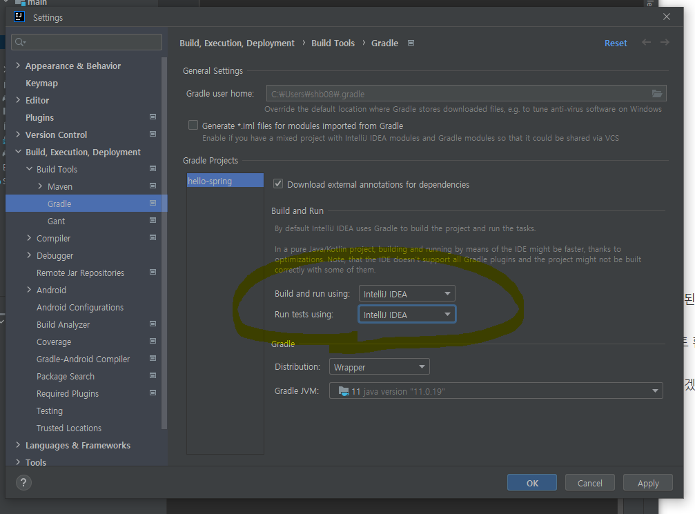 Settings(preference) 에서 gradle 을 검색한 후에 Build and run & Run test 둘 다 IntelliJ 로 바꿔주세요. gradle 을 통해서 실행을 하면 좀 느리게 실행될 때가 있습니다.