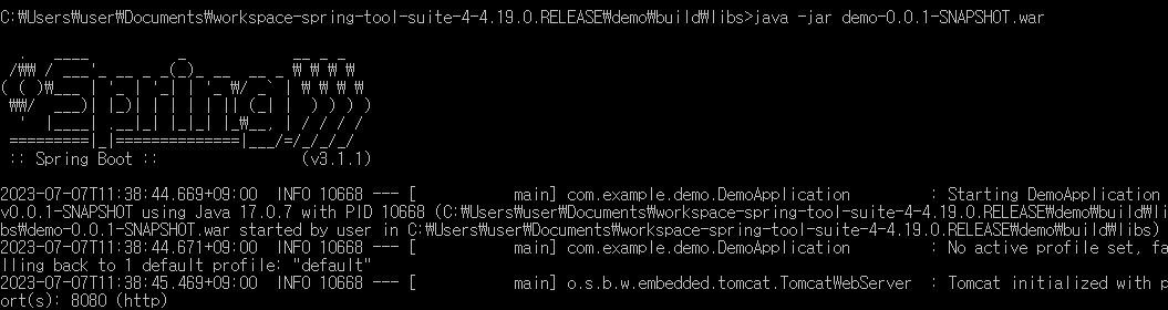 java -jar "war 파일이름" 을 입력한 다음 실행하면 위와 같은 출력 화면을 확인할 수 있다.