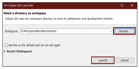 3. 이클립스를 실행하고 작업폴더를 workspace폴더로 선택한다.