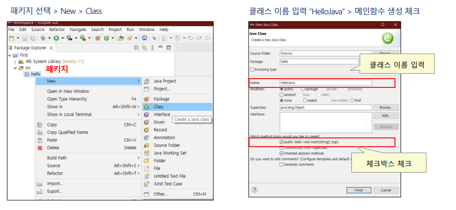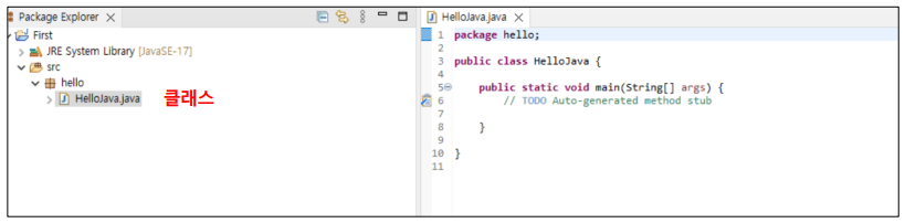 패키지 밑에 HelloJava라는 이름으로 클래스를 생성한다. 프로그램은 모두 클래스를 기반으로 구성된다.