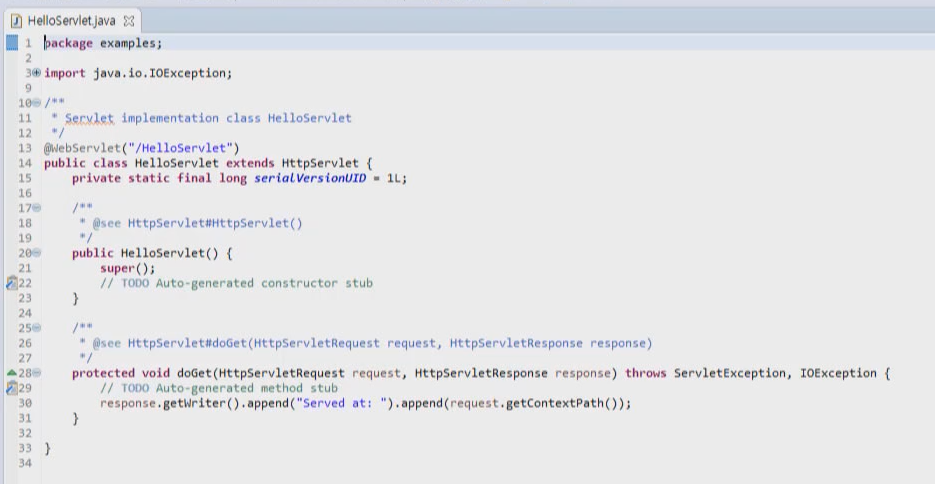 그럼 위와 같은 Servlet 파일이 생성된 것을 확인할 수 있습니다. 우리가 HTTP 프로토콜에 대해서 배울 때 HTTP request 의 첫 번째 줄에 메서드라는 것이 있다고 배웠었습니다. 메서드에는 Get, Delete 등이 있다고 배웠습니다. 웹 브라우저가 Get 메서드 방식으로 요청을 보낼 때 서블릿에 doGet 메서드가 호출됩니다. Get 메서드는 웹 브라우저가 서버에게 문서를 요청할 때 사용하는 방식입니다. 우리의 현재 목적은 서블릿의 실행을 보는 것이기 때문에 코드를 조금 수정해 보겠습니다. 우선, 서블릿을 통해 Get request 가 전달될 때 실제로 실행되는 부분은 doGet 메서드 부분입니다. 그러니까 해당 부분의 메서드를 우리의 필요에 따라 수정해보겠습니다.