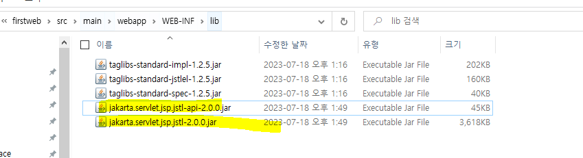 위 주소로 접속하면 같은 문제에 답한 사람의 글을 볼 수 있는데, 매우 간단하다.위 2 파일 다운로드 받은 다음에 WEB-INF/lib 에 넣어주면 된다. 이렇게 넣어주고 프로젝트 Refresh 해준 다음 다시 서버 동작 시키면 정상적으로 구동하는 것을 볼 수 있다.