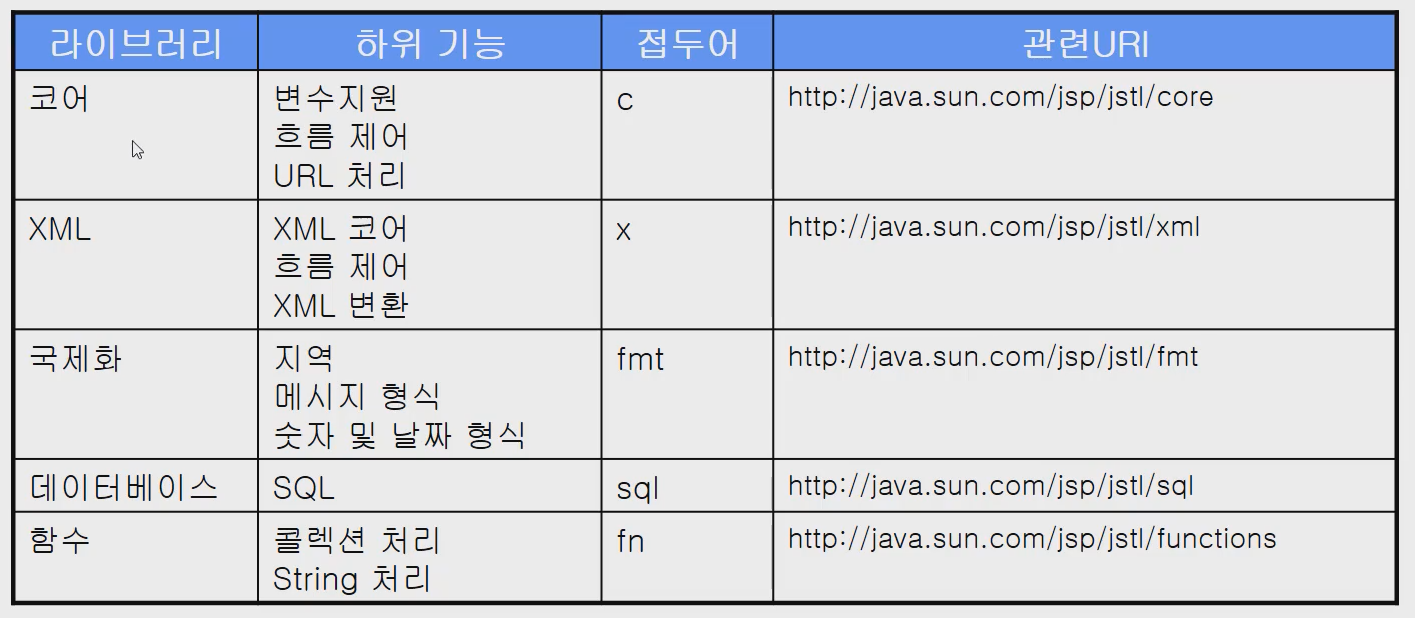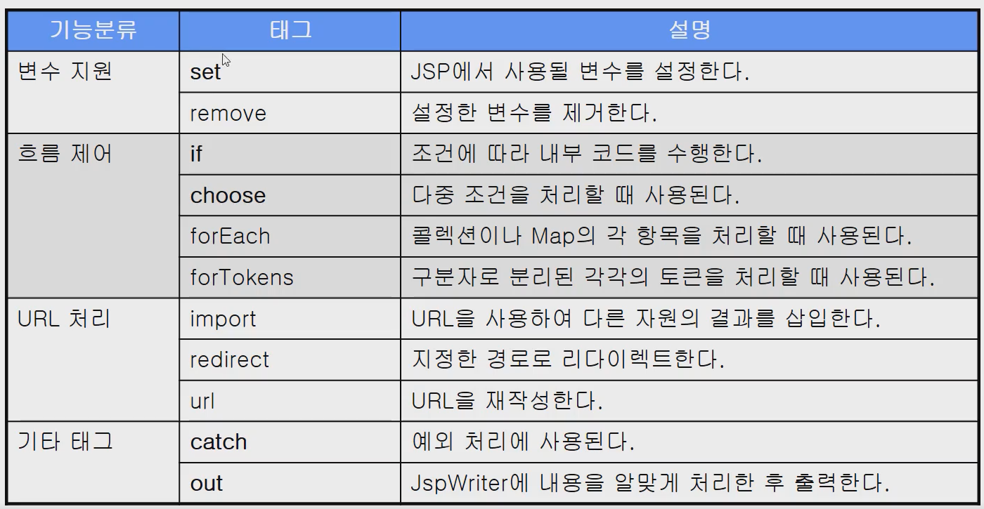 JSTL 이 제공하는 태그는 굉장히 다양합니다. 가장 중요한 코어 라는 태그는 조건문 반복문 이라는 로직을 제어합니다. 이번 강의에서는 코어 부분만 살펴보겠습니다.