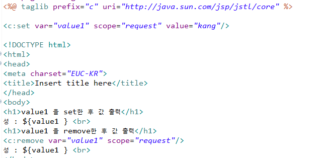 코어 태그 중에서 set 을 먼저 살펴보겠습니다. 우리가 이전에 사용했던 scope 에 값을 저장하는 기능을 set 이 수행합니다. set 태그를 사용해서 변수 명과 스코프, 들어갈 값을 모두 지정하여 생성할 수 있습니다. remove 는 생성했던 변수를 제거하는 기능을 수행합니다. 변수명과 스코프를 지정해주어야 합니다. 이번에는 set 과 remove 코어 태그를 실습을 통해서 학습해보겠습니다. JSTL 을 JSP 에서 사용하기 위해 jar 파일 3개를 다운로드 받아서 지정된 위치에 넣어주었다면 이제는 JSP 파일에서 파일 설정을 하나 해주어야 합니다. 위와 같이 페이지 설정을 <@ taglib prefix="c" uri=="http://java.sun.com/jsp/jstl/core" %> 로 지정해줍니다. 이렇게 하면 JSTL 을 사용하기 위한 준비가 모두 끝나게 됩니다. 이제 코어 태그를 사용하여 set 과 remove 를 사용해 봅시다. <c:set ~/> 태그로 내가 원하는 값을 저장했습니다. 저장한 값은 EL 표현언어를 사용하여 ${value1 } 으로 꺼내서 사용했습니다. <c:remove ~> 태그로 내가 원하는 값을 삭제했습니다. 실행된 결과를 보니까 우리가 원하는대로 출력된 것을 확인할 수 있습니다.