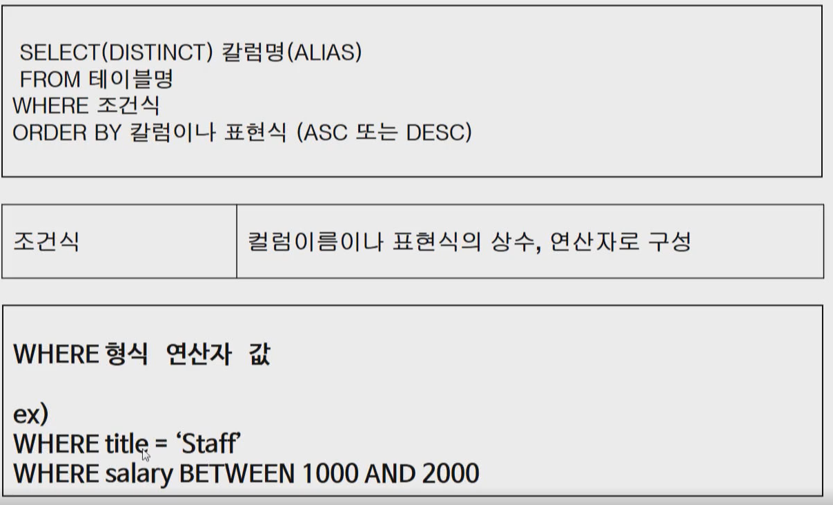 Where 절에 대해서 알아보겠습니다. Select 절을 사용하는 이유가 내가 원하는 조건을 갖는 값을 가져오기 위함인데요. Where 절을 이용하면 조건을 부여할 수 있습니다. Where 절에 산술 비교 연산자를 사용할 수도 있습니다. 이번에는 = 이라는 논리연산자와 함께 실제로 where 절을 사용해보겠습니다. where 컬럼 in (x) 도 사용 가능하다. 특정 행을 검색할 수 있다. Like 키워드도 사용할 수 있다. 와일드 카드와 함께 사용하는데 %와 _가 있다.
