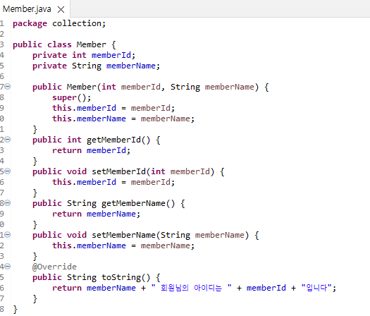 collection 패키지 하위에 프로그램 전반에서 공통으로 사용할 '회원'을 나타내는 Member 클래스를 만들어 보겠습니다. 멤버 변수는 private 변수로 선언하고 getter 와 setter 를 제공합니다. 나중에 회원 정보를 출력하기 위해 toString( ) 메서드를 재정의했습니다.