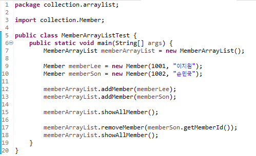 [ MemberArrayList 클래스 : ArrayList 를 활용해 회원 관리 프로그램 구현하기 ] ArrayList 를 활용한 MemberArrayList 클래스에서는 3가지 메서드를 제공합니다. 회원을 추가하는 addMember( ) 메서드, 회원을 삭제하는 removeMember( ) 메서드, 회원 전체를 출력하는 showAllMember( ) 메서드입니다. [ MemberArrayListTest 클래스 : MemberArrayList 의 테스트 클래스 ] 이렇게 만든 클래스를 활용하여 회원을 추가하고 삭제하며 프로그램이 잘 구현되었는지 확인해 보겠습니다. collection.arraylist 패키지 하위에 MemberArrayListTest 클래스를 생성합니다.