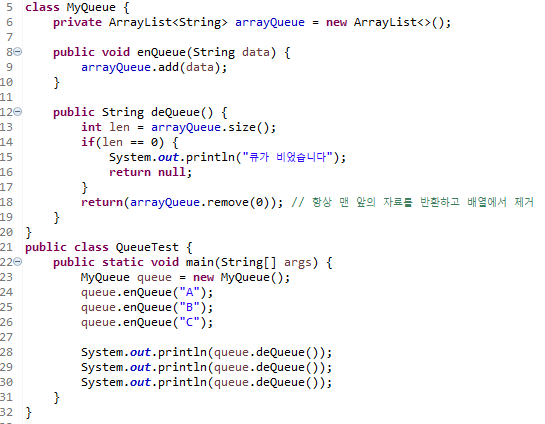 큐는 FIFO 이었습니다. 프로세스 관리, 콜 센터 등에서 활용되는 구조입니다. ArrayList 로 큐를 구현해 보겠습니다. enQueue( ) 메서드는 ArrayList 맨 뒤에 요소를 추가합니다. 큐에서 자료를 꺼내는 deQueue( ) 메서드는 ArrayList 맨 앞에 있는 요소부터 제거하고 반환합니다.