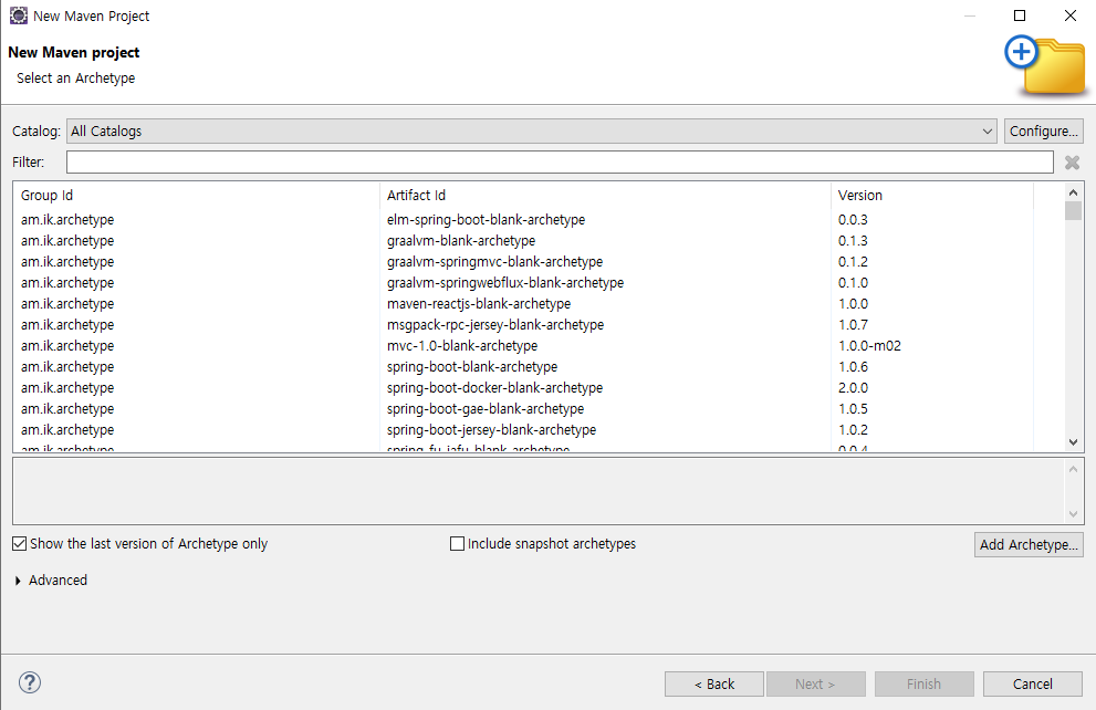 Archetype 을 선택하라는 창이 뜹니다. Archetype 은 Maven 프로젝트에서 제공하는 템플릿을 이야기 합니다. 어떤 것을 지정하느냐에 따라 프로젝트 구조가 달라집니다. 기업들은 자신만의 Archetype 을 만들어서 사용하기도 합니다. 이번 시간에 우리는 Maven Archetype quick start 를 사용해 보겠습니다.