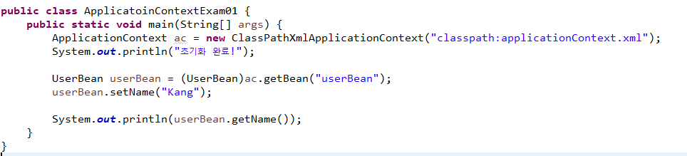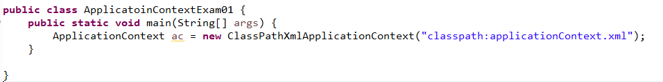 ApplicationContextExam01.java 라는 파일을 하나 생성해주겠습니다. 이 파일에서는 스프링이 가진 공장을 생성해야하잖아요.스프링이 가진 공장을 만드는 코드를 우선 작성하였습니다.코드를 보면 ApplicationContext 공장을 하나 만드는데요. 공장한테 'bean 클래스 관련 설정들이 여기에 있어 classpath: 를 참조해봐' 라고 알려주는 코드입니다. 여기서 재미있는 점은 우리가 applicationContext.xml 파일을 resources 폴더 아래에 넣었는데요. classpath 를 지정할 때는 따로 경로 설정을 하지 않은 것을 볼 수 있습니다. 그 이유는 resources 폴더를 자동으로 인식을 하기 때문에 그렇습니다. 이렇게 '관습'적으로 지켜야하는 규칙들이 많은 것을 볼 수 있습니다.