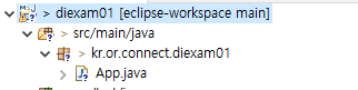 그럼 다음과 같이 diexam01 이라는 maven 프로젝트가 생성된 것을 확인할 수 있습니다. maven 프로젝트 하위에는 pom.xml 파일이 있습니다. 열어보겠습니다.