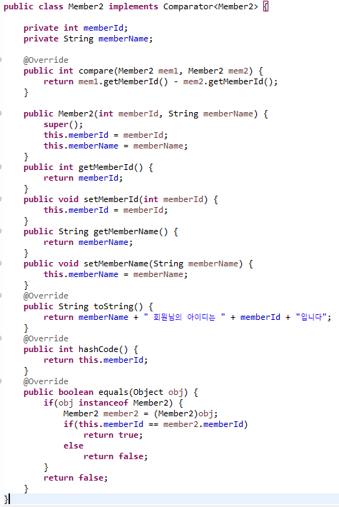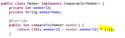 Coparable 인터페이스에는 compareTo( ) 추상 메서드가 있고 이것을 구현해야합니다. 위 코드에서 재정의한 compareTo( ) 메서드의 의미는 다음과 같습니다. this.memberId - member.memberId 로 리턴값을 작성하면 오름차순 정렬을 하겠다는 것을 의미하고  this.memberId - member.memberId*(-1) 로 리턴 값을 작성하면 내림차순 정렬을 하겠다는 것을 의미합니다.