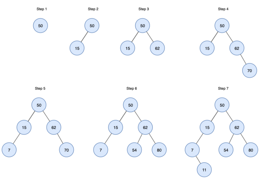 예를 들어 50, 15, 62, 80, 7, 54, 11 순으로 숫자가 입력되었다면 트리가 만들어지는 과정은 위 그림과 같습니다. 이렇게 만들어진 이진 검색 트리는 왼쪽 -> 부모 -> 오른쪽 순으로 순회하면 오름차순이 됩니다. 그 반대로 오른쪽 -> 부모 -> 왼쪽 순으로 순회하면 내림차순이 됩니다. 자바의 TreeSet 은 바로 이런 이진 검색 트리를 활용하여 자료를 정렬합니다.