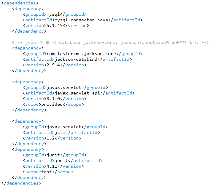 Web API 를 사용하기 위해 몇 가지 라이브러리를 추가하려고 합니다. Maven 을 이용하여 라이브러리를 추가할 것이므로 dependency 태그 안에 적어주면 되겠죠. - mysql : Web api 를 이용하면서 저번 시간에 jdbc 예제와 같이 사용할 것이기 때문에 mysql 라이브러리를 추가해주었습니다. - jackson : Json 데이터를 활용할 것이기 때문에 json 라이브러리를 추가해주었습니다. - servlet : servlet api 가 필요하기 때문에 추가시켜 주었습니다. - jstl : jstl 을 사용하려고 추가해주었습니다.