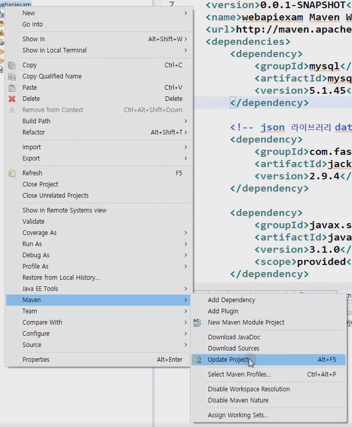 이렇게 필요한 라이브러리들을 추가해주었다면 반드시 Maven - Update Project 를 실행시켜주어야 합니다.