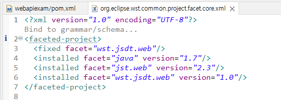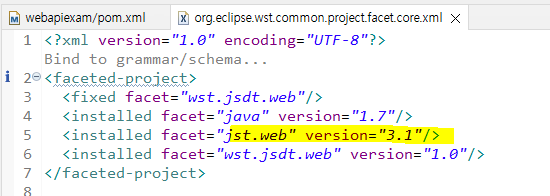 .settings 안을 보면 org.eclipse.wst.common.project.facet.core.xml 이라는 파일이 있다. jst.web 의 버전이 2.3 으로 설정되어 있는 것을 확인할 수 있다. 저희는 서블릿을 최소 2.5 버전 혹은 3.0 이상 버전을 사용했었습니다. 이 부분을 다음과 같이 3.1 버전으로 수정합니다.