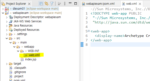이번 예제에서는 Annotation 을 이용해서 서블릿을 설정할 것이기 때문에 web.xml 파일을 삭제할 겁니다. src - main - webapp - WEB-INF - web.xml 을 삭제해줍니다.