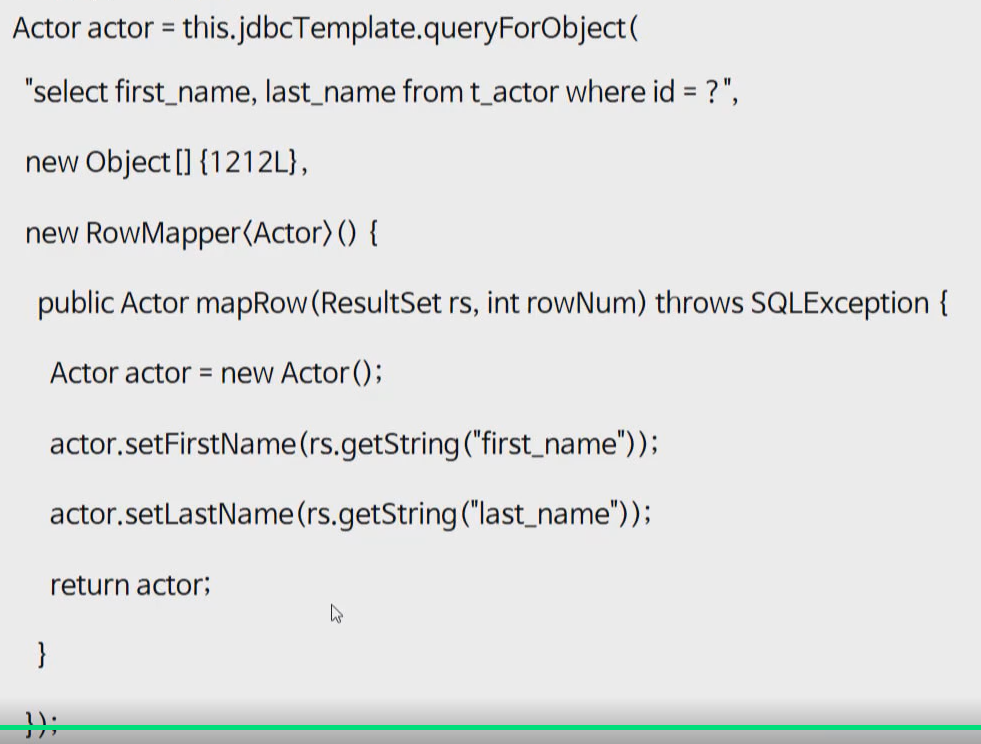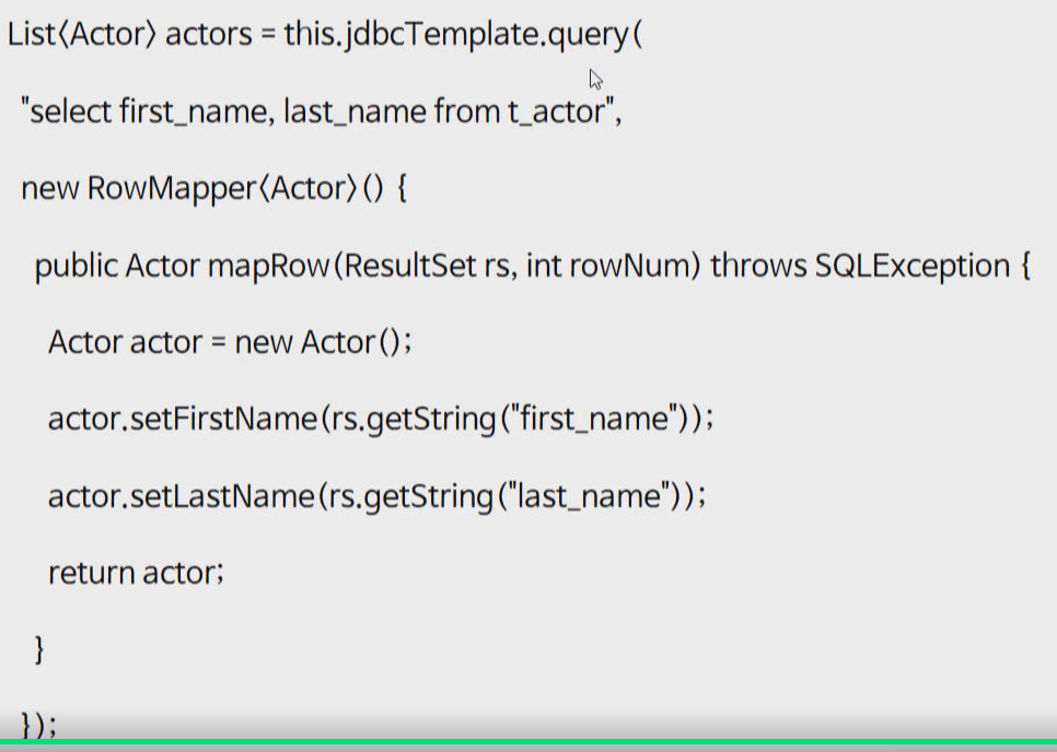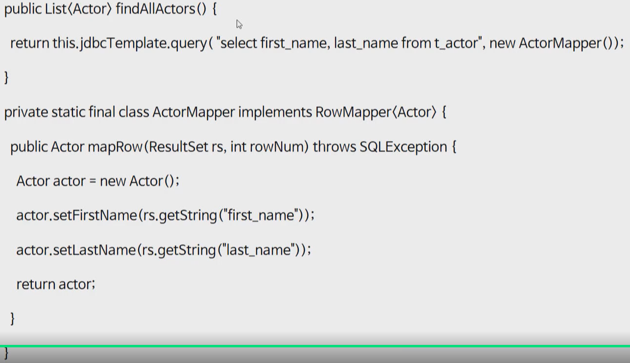 한 행에는 여러 컬럼이 존재합니다. 해당 컬럼들을 원하는 객체에 매핑을 해주어야 하는데요. 이때 사용하는 객체가 RowMapper 라는 객체입니다. RowMapper 를 상속받는 이름 없는 객체를 이용해서 mapRow 라는 메서드를 오버라이딩 하는 것을 볼 수 있구요. 한 건의 결과가 ResultSet에 담겨 있기 때문에 해당 ResultSet 의 값을 actor 에 담아서 return 을 하고 있는 것을 볼 수 있습니다. 이렇게 실행하면 한 행의 데이터를 모아서 리턴을 시켜주게 됩니다.
