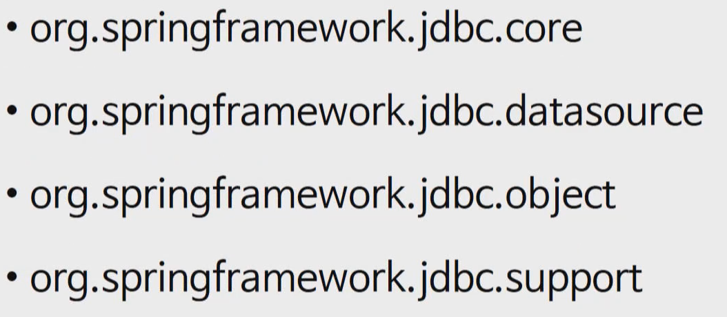 첫 번째, core 패키지는 jdbc 템플릿과 다양한 콜백 인터페이스들을 포함하고 있고 추가로 여러가지 관련 클래스들을 포함하고 있습니다. 두 번째, datasource 패키지는 데이터소스의 접근을 쉽게 하는 utility 클래스와 자바 ee 컨테이너 외부에서 수정되지 않고 운영되는 jdbc 코드와 테스트에서 사용할 수 있는 간단한 데이터들을 가지고 있습니다. 세 번째, object 패키지는 rdbms 의 CRUD 프로시저를 스레드 세이프하고 재사용 가능한 객체로 나타내는 클래스를 포함하고 있습니다. 네 번째, support 패키지는 exception 변환 기능과 약간의 utility 기능들을 제공하고 있습니다. 이런 패키지들은 잘 알고 있으면 필요한 부분들을 찾아서 사용할 수 있습니다.