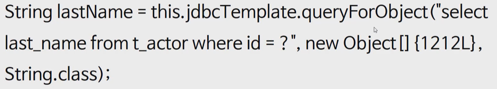 위 쿼리문을 보면 Select 를 하는데 변수를 바인딩 하는 부분이 있습니다. (? 물음표를 활용하는 부분) 쿼리문을 항상 정해진 값으로 수행하는 것이 아니라 동적으로 동작하게 만들기 위해서는 where 조건문에 들어가는 값이 수행될 때마다 달라질 수 있는데요. 이럴 때 처리해주는 방법입니다. ? 물음표에 들어가는 값은 두 번째 파라미터에 넣어줍니다. 기존 JDBC 보다 훨씬 간단하게 실행할 수 있는 것을 볼 수 있습니다.