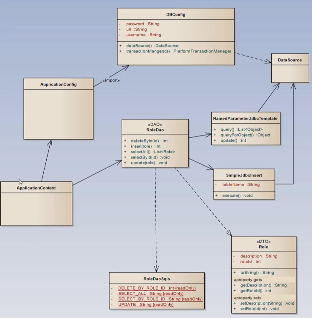 우리가 작성할 프로그램의 구조를 살펴보고 시작하겠습니다. Spring Container 인 ApplicationContext 는 설정파일로 ApplicationConfig 라는 파일을 읽어드립니다. ApplicationConfig 에는 @ComponentScan 어노테이션이 DAO 클래스를 찾도록 설정할 겁니다. 찾은 모든 DAO 클래스는 Spring Container 가 관리하게 됩니다. ApplicationConfig 는 DBConfig 클래스를 import 하게 됩니다. DBConfig 클래스는 dataSource 와 transactionManager 객체를 생성합니다. DAO 는 필드로 NamedParameterJdbcTemplate 과 SimpleJdbcInsert 를 가지게 될 거구요. 두 개의 객체는 모두 dataSource 를 필요로 할 겁니다. 두 개의 객체 모두 SQL의 실행을 편리하게 하도록 스프링 JDBC에서 제공하는 객체인데요. 두 객체가 그런 특징을 갖는 이유는 DB 연결을 위해서 내부적으로 dataSource 를 사용하기 때문입니다. 이 두 개의 객체는 RoleDao 생성자에서 초기화를 하게 되구요. RoleDao 생성자에서 초기화된 두 개의 객체를 이용해서 RoleDao 의 메서드들을 사용하게 됩니다. Spring JDBC를 사용하는 사용자는 Parameter 와 SQL 을 가장 많이 신경써야 합니다. SQL 은 RoleDao 객체에 상수로 정의를 해놓음으로써 나중에 SQL 이 변경될 경우에 좀 더 편하게 수정할 수 있도록 하였습니다. 그리고 한 건의 Role 정보를 저장하고 전달할 목적으로 Role DTO 가 사용되고 있는 것을 볼 수 있습니다. 우리가 만들 프로그램의 구조가 어떻게 생겼는지 숙지를 하시고 이 부분들을 참고하시면 도움이 되실 것 같습니다.