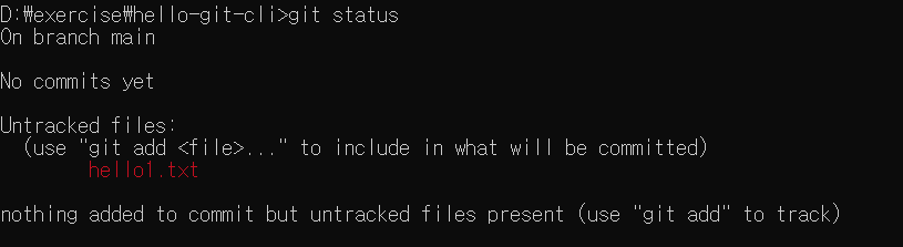 git 에게 지금 상태가 어떠냐고 묻는 것이 git status 입니다. No commits yet 은 아직 버전이 없다는 것을 의미합니다. Untracked fileds 는 지금 추적되지 않고 있는 파일이 hello1.txt 라고 알려주고 있습니다. git 은 여러분이 명시적으로 이 파일을 버전관리 할 거야! 라고 알려주어야 합니다. 그렇지 않으면 git 은 알려주지 않은 파일들을 없는 셈으로 치게 됩니다. 그래서 hello1.txt 파일은 아직 git 에게 관리하라고 명령하지 않았기 때문에 Untracked 상태인 것이죠.
