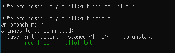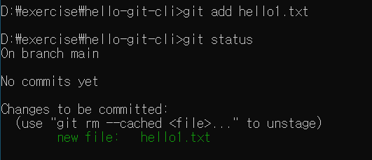 git status 를 통해서 Changes to be committed 상태에 hello1.txt 가 들어가 있는 것을 볼 수 있습니다.