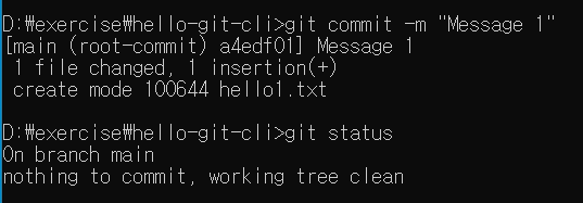git commit 한 칸 띄고 -m "Message 1" 이라고 적습니다. 그리고 엔터를 치면 버전이 생성이 됩니다. 그러면 hello1.txt 파일은 Staging Area 에서 Repository로 넘어가게 됩니다. git status 를 입력하면 이제 다음과 같이 출력됩니다.