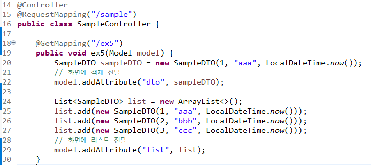 이번에는 ex5 메서드를 만들었습니다. ex5 메서드에서는 객체를 전달하는 것과 리스트를 모델단으로 전달하는 것을 볼 수 있는데요.