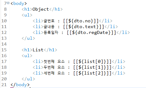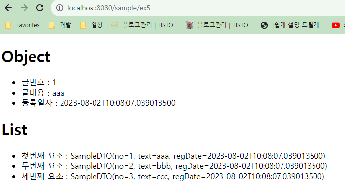 ex5.html 파일을 작성하였는데요. dto 에 담긴 데이터를 꺼내는 표현식과 List 에 담긴 데이터를 꺼내는 표현식을 확인할 수 있습니다.