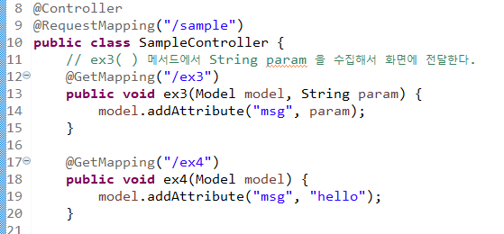 우선 SampleController 에 ex3, ex4 메서드를 추가했습니다. ex3 메서드에는 param 매개변수가 있는데요. 따라서 사용자가 해당 메서드를 호출하기 위해서는 URL 주소에 ?param=aaa 와 같이 입력해야 메서드를 출력할 수 있게 됩니다.