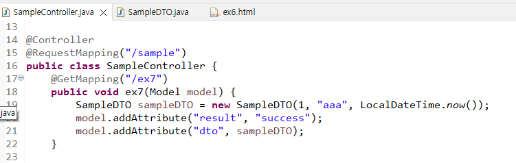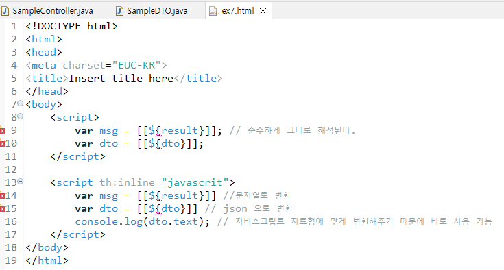 ex7.html 파일을 작성해주었는데요. 컨트롤러에서 전달받은 값을 사용하게 됩니다. 여기서 문제는 타임리프를 사용하지 않으면 전달받은 데이터를 그대로 해석하게 됩니다. 타임리프의 inline 을 사용하면 dto 변수가 객체로 변환이 되기 때문에 dto.text 처럼 바로 사용할 수 있게 됩니다.