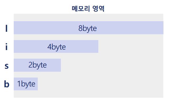 - 정수자료형에는 바이트 크기별로 byte, short, int, long형 4종류가 있다.