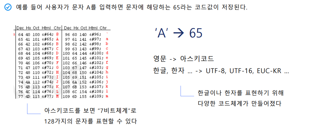 - 컴퓨터는 문자를 이해할 수 없기 때문에 문자도 숫자로 변환해서 저장해야 한다.