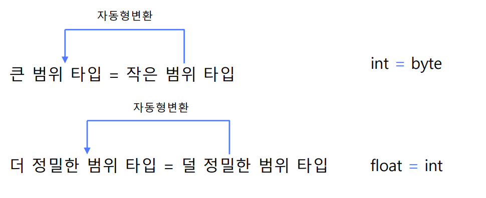 - 바이트 크기가 작은 자료형에서 큰 자료형으로 대입하는 경우 형 변환이 자동으로 이루어집니다.