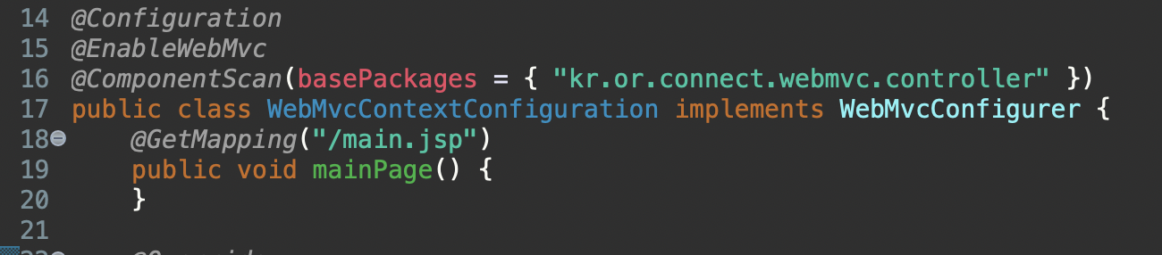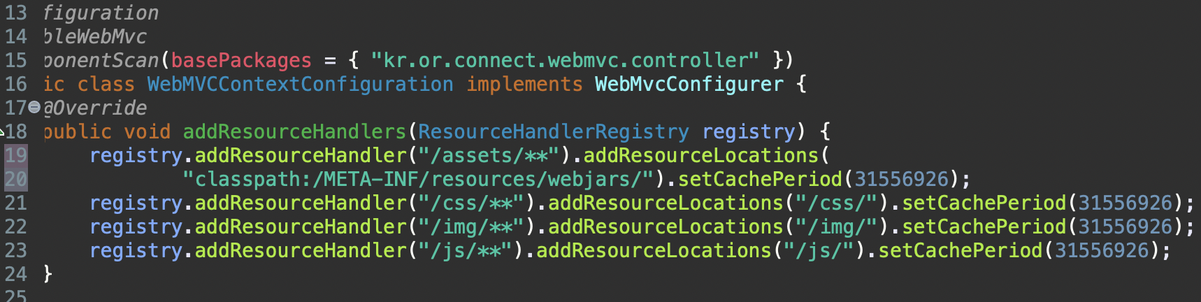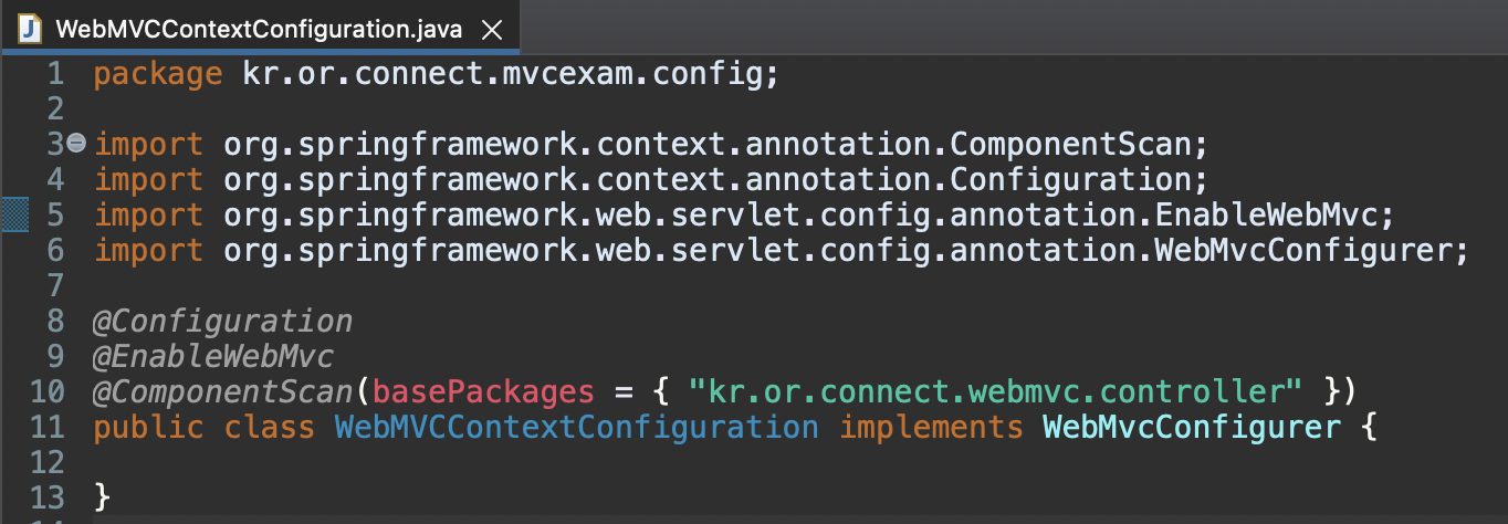 우선 강의와는 다르게 클래스가 extends WebMvcConfigurerAdapter 하지 않고 implements WebMvcConfigurer 하고 있는 것을 확인할 수 있는데, 스프링 부트 2.0 부터 java8과 스프링 5.0을 사용하면서 WebMvcConfigurer 메서드에 default를 선언했다. 쓰임새가 사라진 WebMvcConfigurerAdapter 는 제외되었습니다. 그 다음 패키지 안에 WebMVCContextConfiguration 라는 자바 클래스 파일을 하나 추가해줍니다. @Configuration 애노테이션은 이 자바 파일이 설정 파일임을 알려주고요. @EnableWebMvc 애노테이션은 기본적인 설정들을 자동으로 해주고요. @ComponentScan 애노테이션은 'controller' 라는 애노테이션이 붙은 것들을 읽어와서 사용할 수 있도록 해줍니다. 여기서 basePackages 를 사용하면 중괄호를 사용하여 여러개를 지정할 수 있습니다. @ComponentScan 을 사용할 때는 패키지 경로를 지정을 해주어야 하는데요. 그렇지 않으면 어느 경로부터 읽어야 할지 모르기 때문에 수행이 안될 수도 있습니다.
