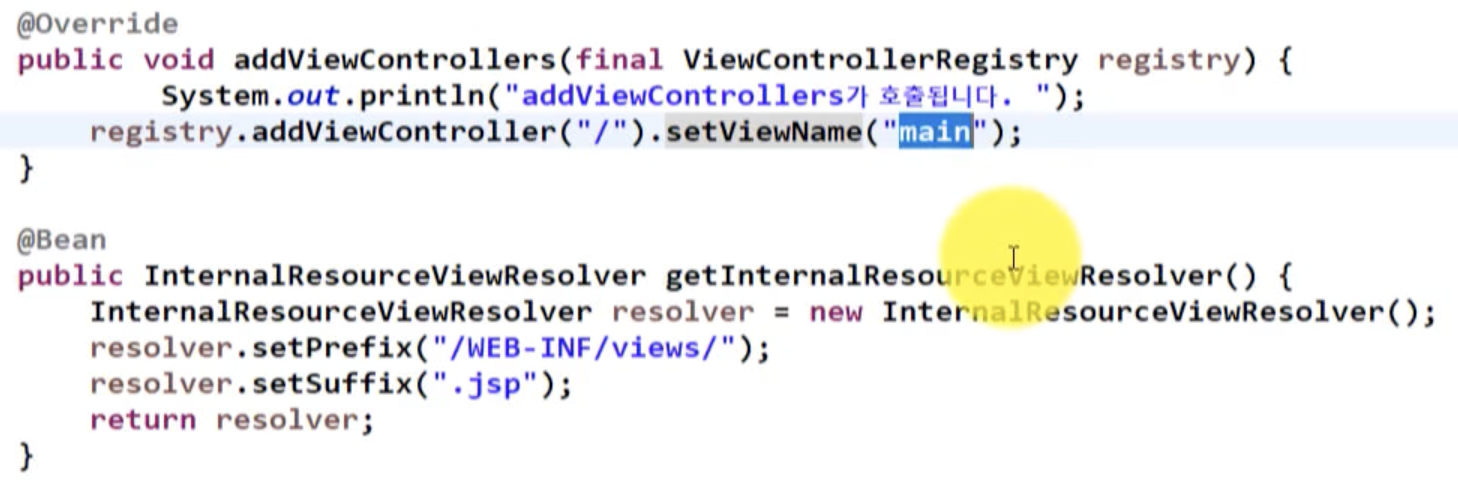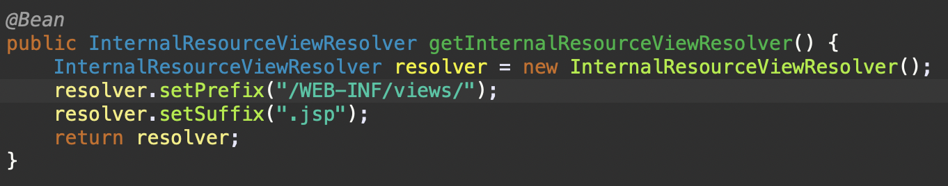 이 view main 은 ViewResolver 객체를 이용해서 찾게 되는데요. 실제 main 이라는 이름만 가지고는 View 정보를 찾아낼 수는 없구요. View 정보는 getInternalResourceViewResolver 라는 메서드에서 설정된 형태로 View 를 사용하게 됩니다. 위 코드 내부를 보면 InternalResourceViewResolver 객체를 생성한 다음 resolver 의 Prefix 와 Suffix 를 지정하는 것을 볼 수 있는데요. 바로 위 addViewController 에서 사용된 name 인 main 앞에 Prefix 에서 설정한 주소를 붙여주고 뒤에 Suffix 에서 지정한 주소를 붙여주게 됩니다. 이 뷰 정보는 결국 /WEB-INF/views/main.jsp 가 되게 됩니다.