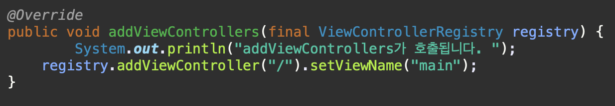 그 다음 addViewController( ) 메서드를 오버라이드하고 있는 것을 볼 수 있는데요. addViewController 메서드는 특정 URL 에 대한 처리를 컨트롤러 클래스를 작성하지 않고 맵핑할 수 있도록 해주는데요. 요청 자체가 / 하고 들어오면 main 이라고 하는 뷰로 보여주도록 하는 거죠.