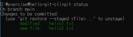 자 아무튼, hello1.txt 파일을 열어서 2-1 이라는 데이터로 수정을 해 준 다음에 한 번에 버전으로 만들어보겠습니다. 지금 git status 상태는 다음과 같습니다.