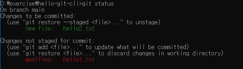 hello2.txt 는 아직 한 번도 버전관리를 하지 않은 상태이기 때문에 Untracked 상태인 것을 알 수 있습니다. git 은 저 파일을 없는 셈으로 치기 때문에 git에게 관리를 시켜야 합니다.