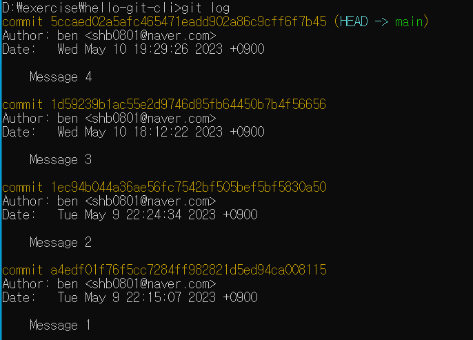- git log 를 찍어주면 "Revert Message 4" 라는 버전이 하나 생긴 것을 볼 수 있습니다.