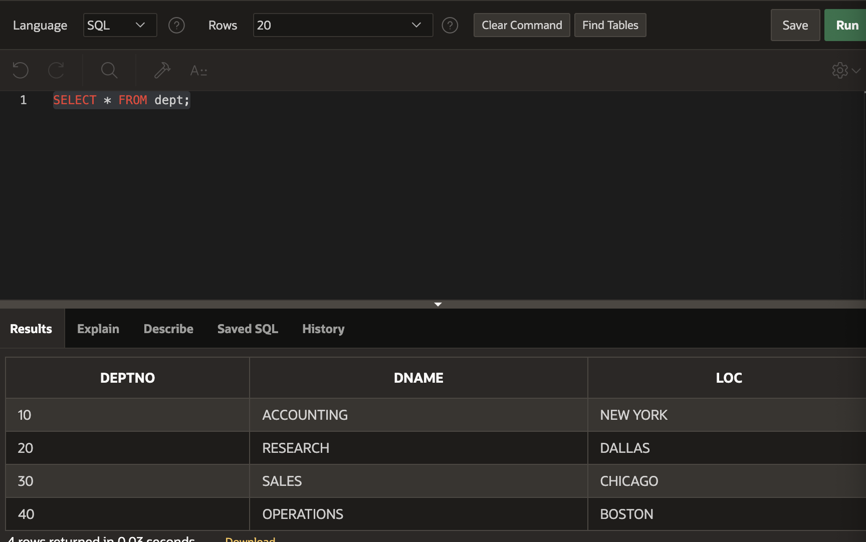 위와 같이 SQL 을 입력한 후에 실행하고자 하는 SQL 을 복사해서 RUN 버튼을 클릭하면 아래와 같이 검색되는 결과를 확인할 수 있다. 위에 있는 Row 에 입력하는 것은 검색 결과의 행 수를 제한하는 것이다. dept 테이블에 대한 SQL 도 정상적으로 처리되는 것을 확인할 수 있다.