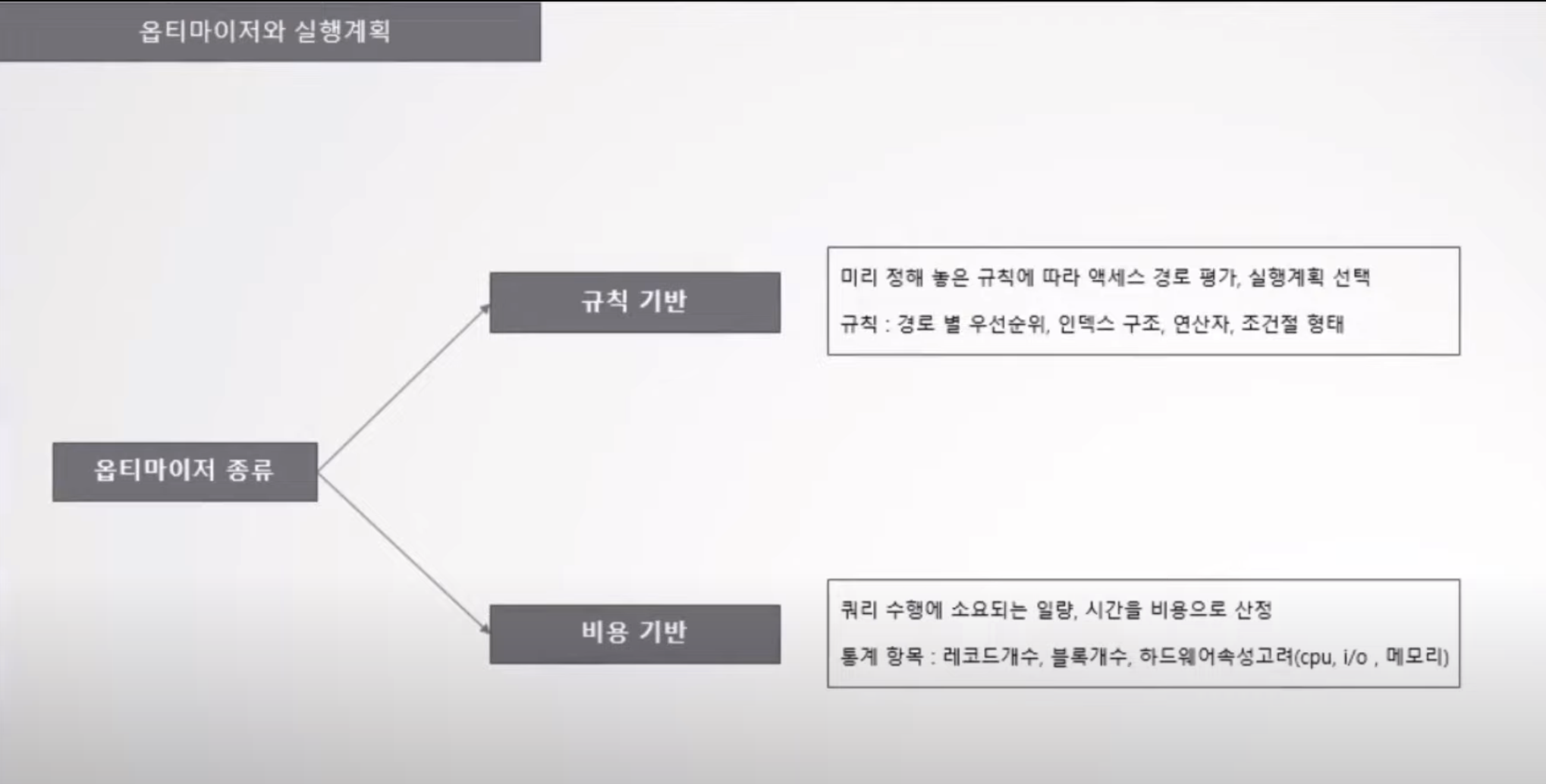 옵티마이저는 규칙 기반과 비용 기반이 있다. 비용 기반이 좀 더 똑똑한 친구이다. 규칙 기반은 우선순위가 높은 규칙을 토대로 SQL 을 실행시킵니다. 반면에 비용 기반은 통계 정보를 기반으로 좀 더 세세하게 계산을 해서 SQL을 동작시키게 됩니다.
