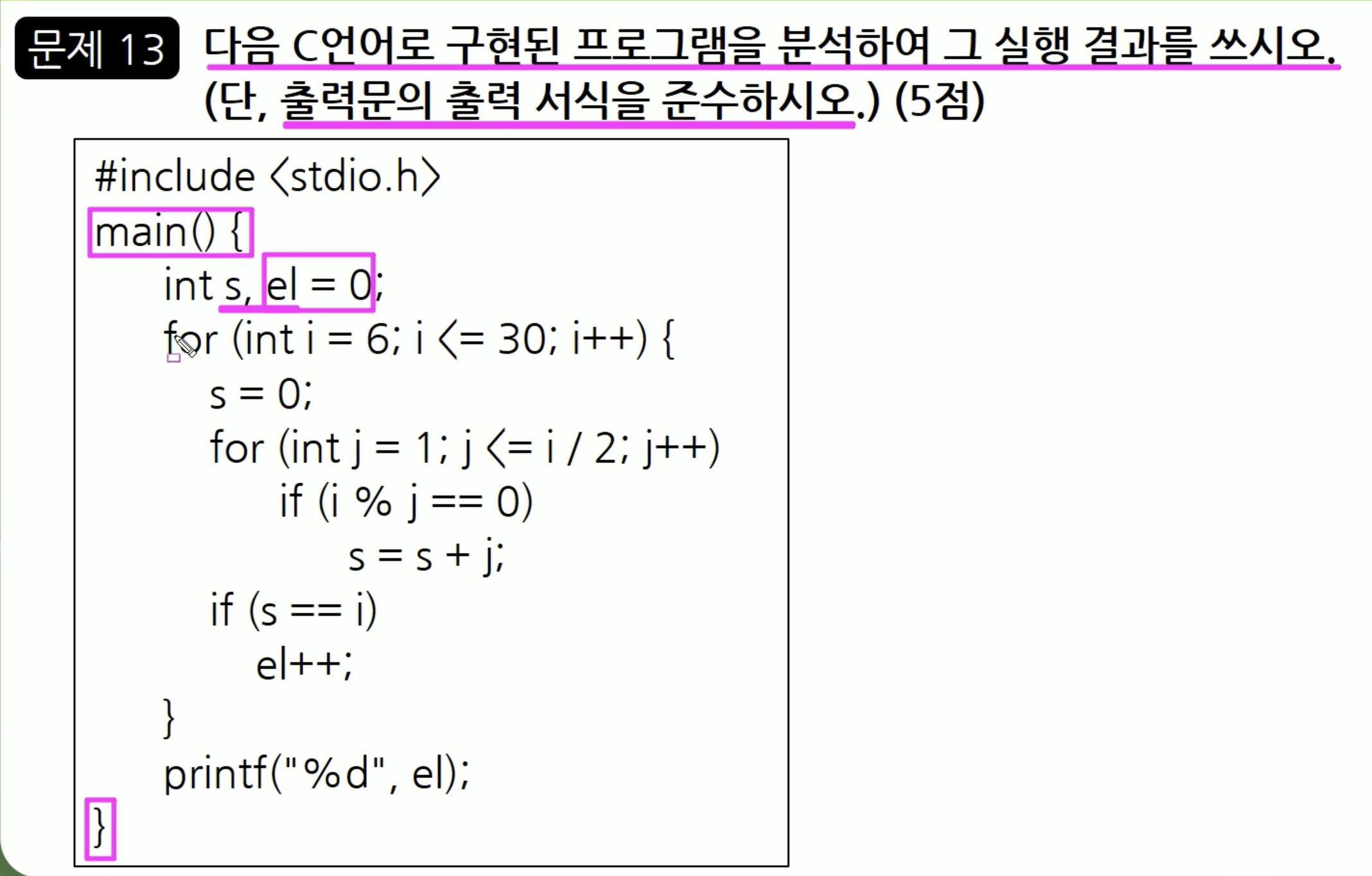 로직을 분석해보면 i 변수 자기 자신을 제외한 소인수분해 숫자들의 합이 자기 자신 i 와 같은 경우 el 의 변수에 1씩 더해주는 로직을 i = 6 ~30 까지 적용하는 로직인데요. 해당 로직을 만족하는 변수 i 는 6과 28 밖에 없습니다. 따라서 답은 2가 됩니다. 디버깅을 하는 것은 손수 따라가면서 하다보면 로직을 금방 익힐 수 있습니다.