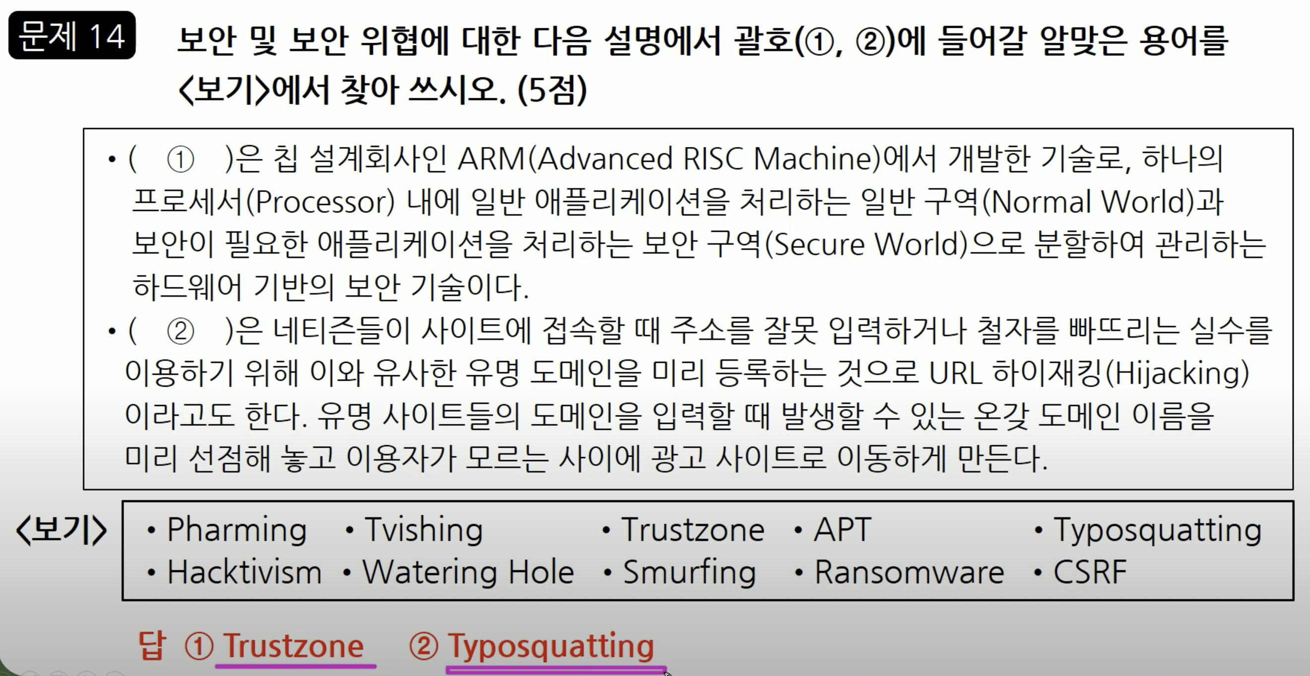 답을 적을 때는 1번 동그라미를 그린다음 해당하는 답을 적는 식으로 적어주어야 정답으로 인정됩니다. Trustzone, Typosquatting 이라고 적으면 정답으로 인정되지 않으니 주의해야 합니다.
