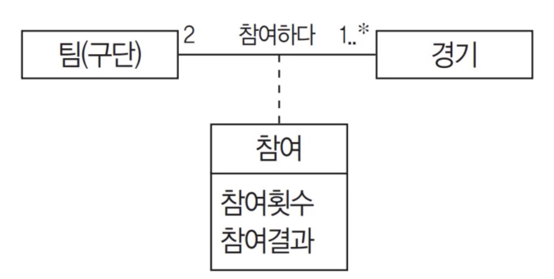 예를들어, 팀 클래스와 경기 클래스가 있을 때, 팀이 경기에 참여하는 상황에서 참여횟수와 참여결과 속성을 어디에 두어야 할까요? 먼저 '팀' 클래스에 참여횟수와 참여결과 속성을 둔다면 팀이 어느 경기에 참여한 것인지 모호해집니다. 또한 '경기' 클래스에 참여횟수와 참여결과 속성을 둔다면 어느 팀이 참여한 것인지 모호해집니다. 이런 경우 '팀'이나 '경기' 클래스의 속성이 아닌 '참여하다'라는 연관 관계에 대한 연관 클래스를 만들어 '참여횟수'와 '참여결과' 속성을 연관 클래스의 속성으로 다루면 됩니다.